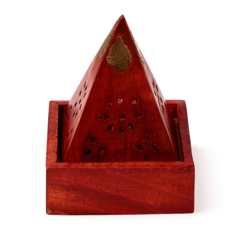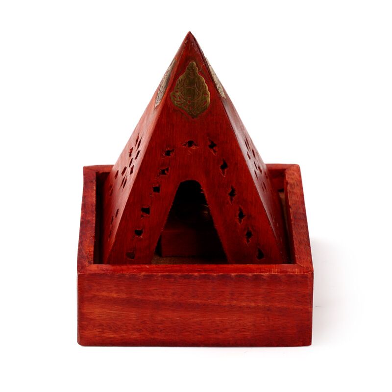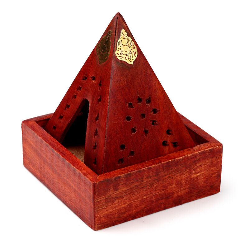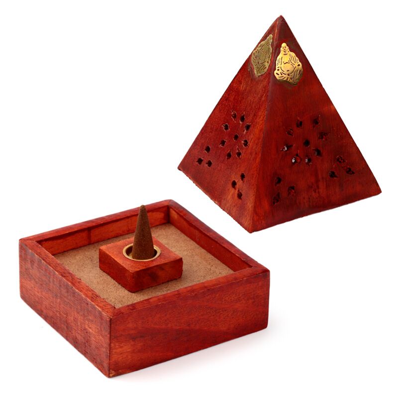 Mangoträ Pyramid Rökelsehållare & Låda för Koner med Buddha & Nätmönster
